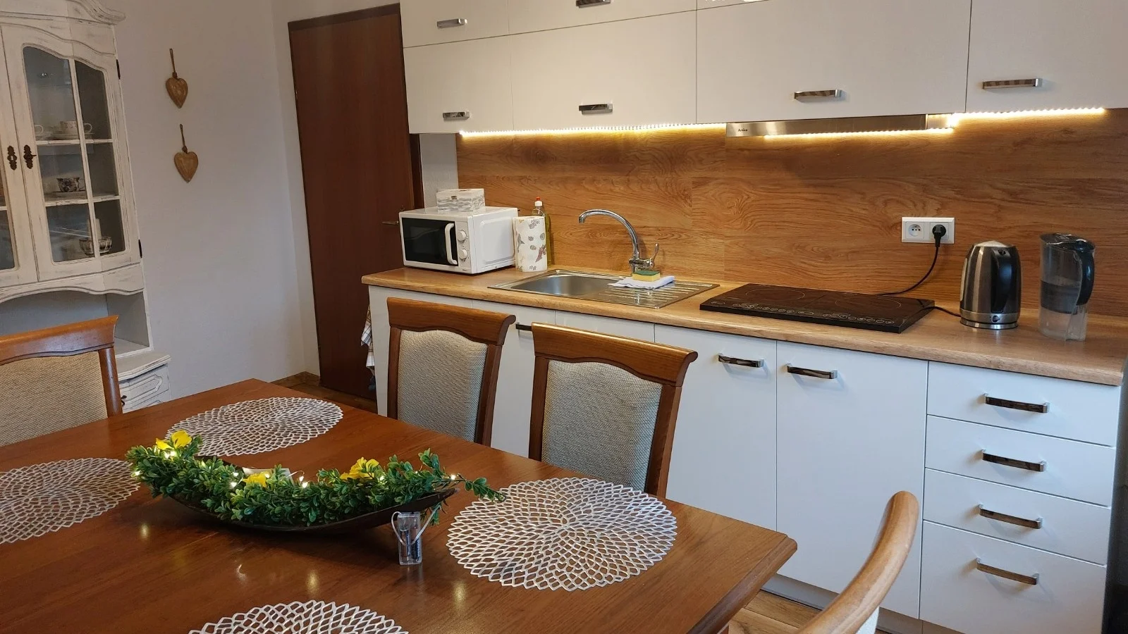 Do dyspozycji gości aneks kuchenny z pełnym wyposażeniem: płyta grzewcza, kuchenka mikrofalowa, lodówka, czajnik oraz naczynia.